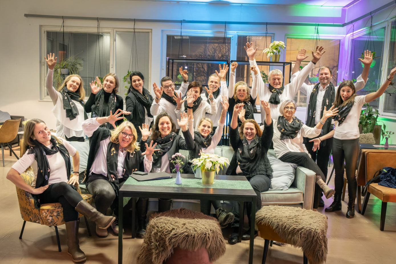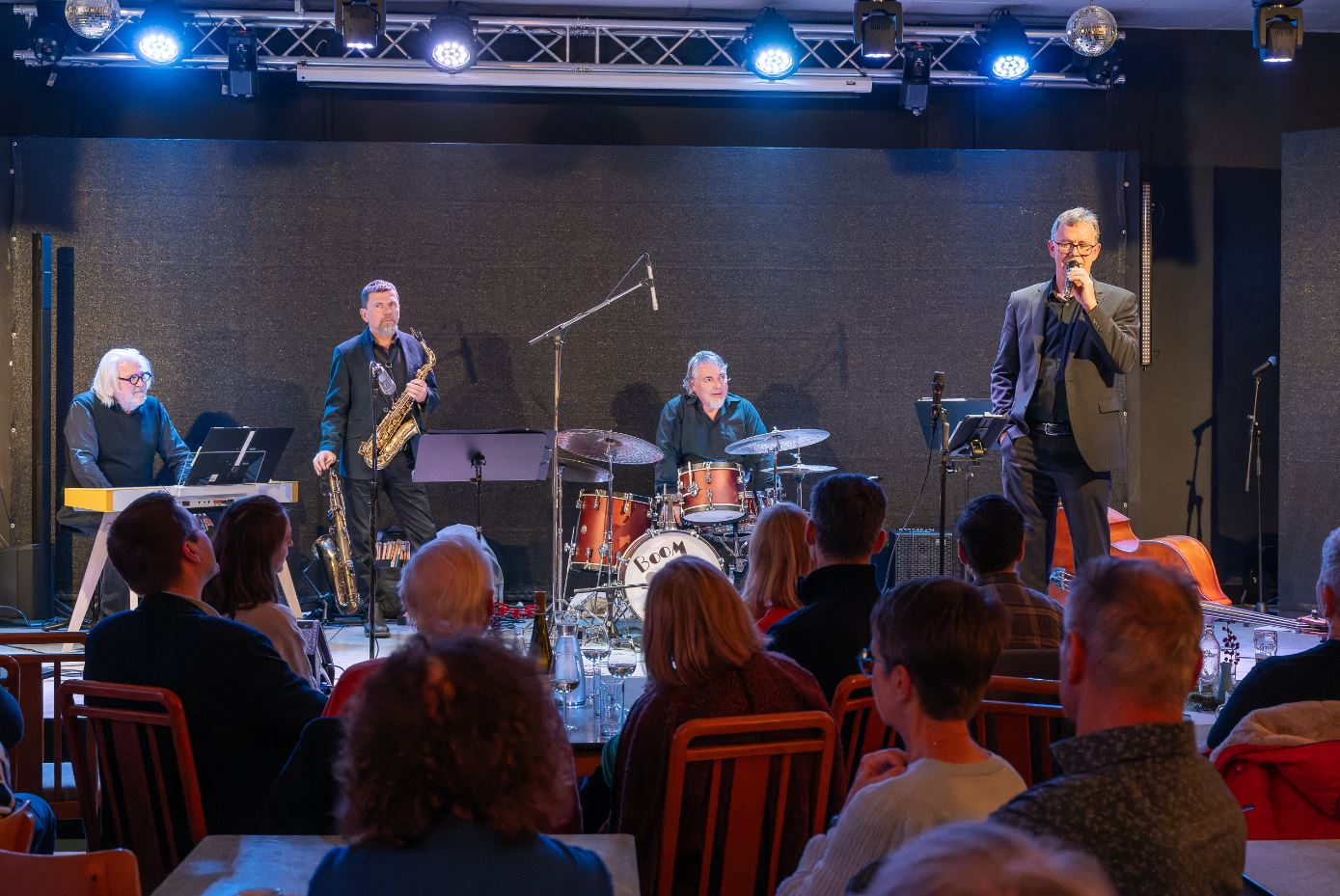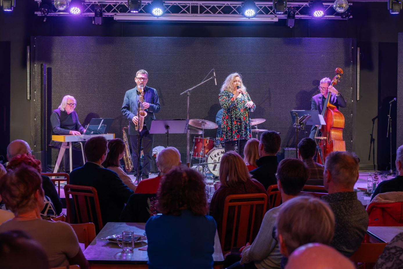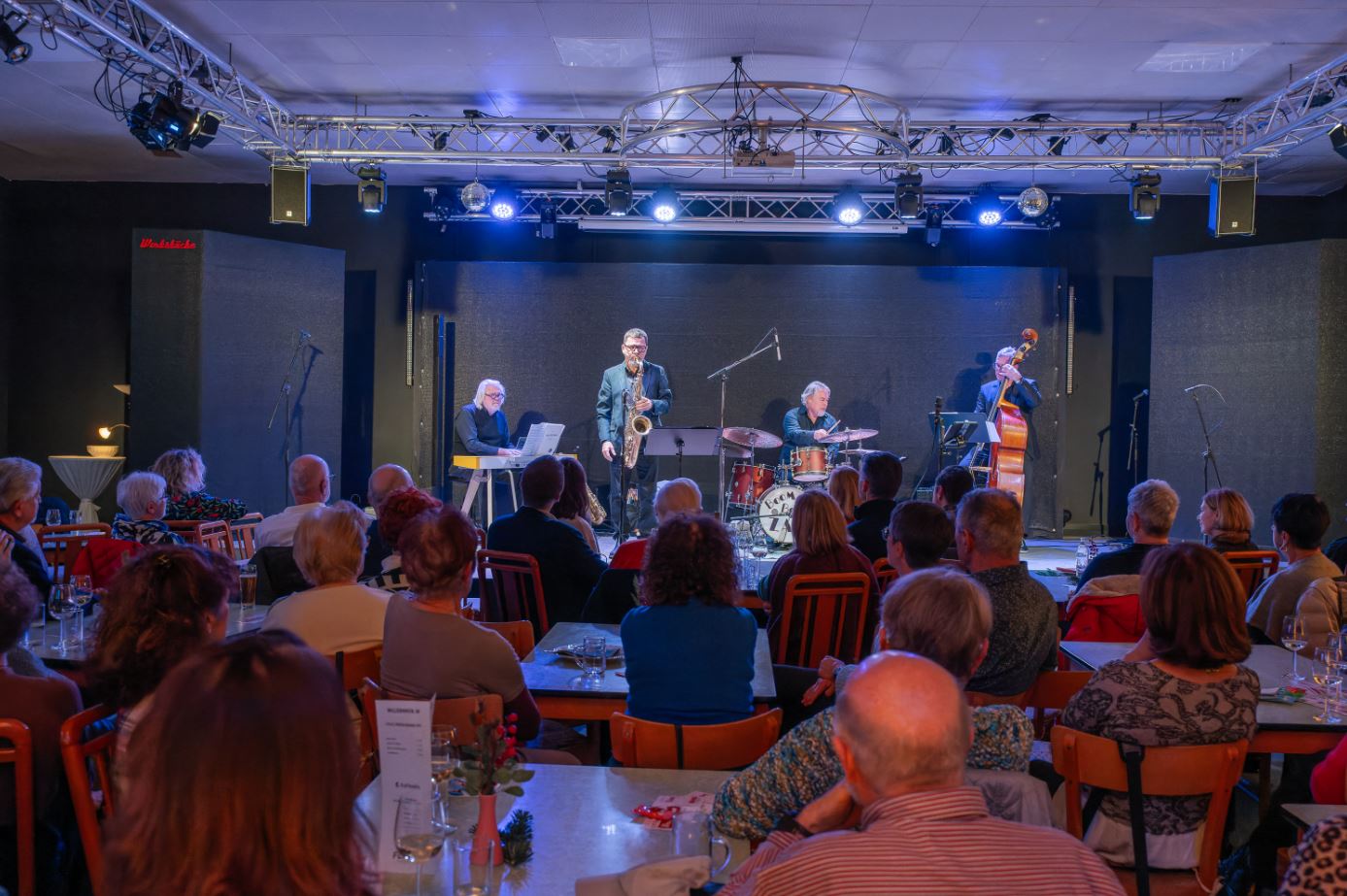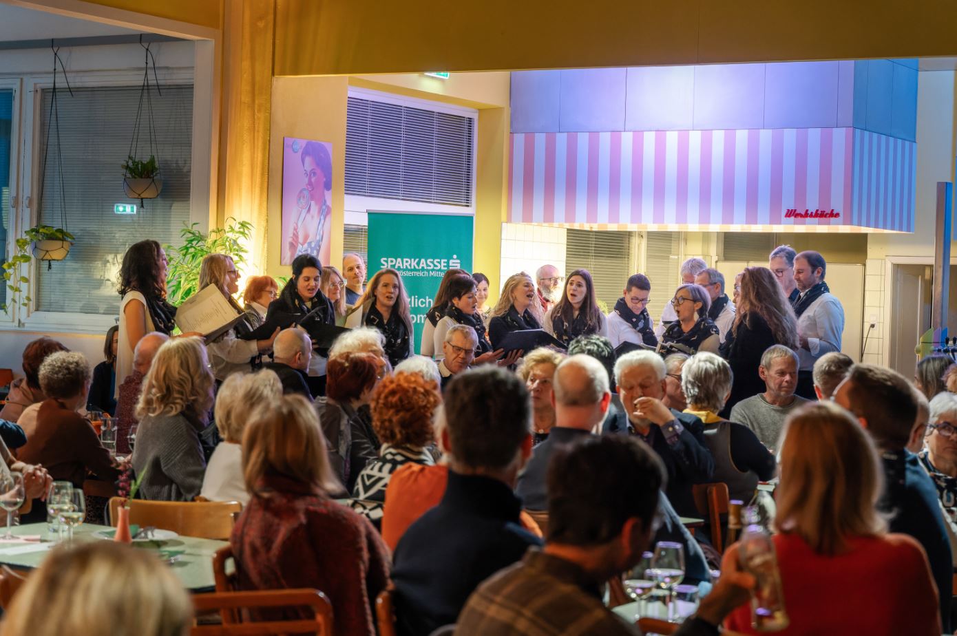Das mit 17 Sänger:innen angereiste Ensemble 3150 gab sich abwechselnd mit den Jazz Baristas, bestehend aus Klaus Zalud (Drums), Franz Griesler (Bass), Johnny Leonhardsberger (Saxofon), Herbert Schedlmayer (Klavier) sowie der bezaubernden Analena Matejschek (Gesang) einen abwechslungsreichen Abend,