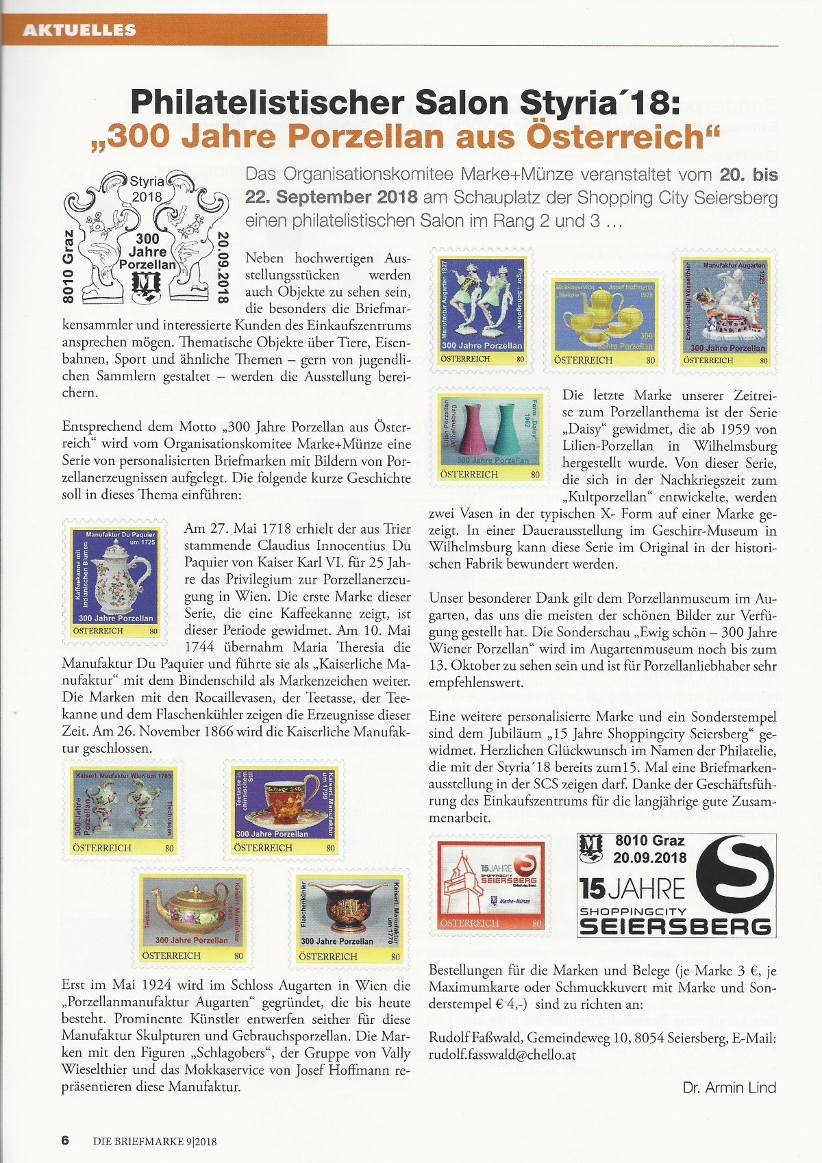 Der Verein "Organisationskomitee Marke + Münze veranstaltet seit 1991 regemäßig Briefmarkenausstellungen mit verschiedenen Schwerpunkten. Die aktuelle Ausstellung im September 2018 in der Shoppingcity Seiersberg (Nähe Graz) wurde dem speziellen Thema "300 Jahre Porzellan aus Österreich" gewidmet.