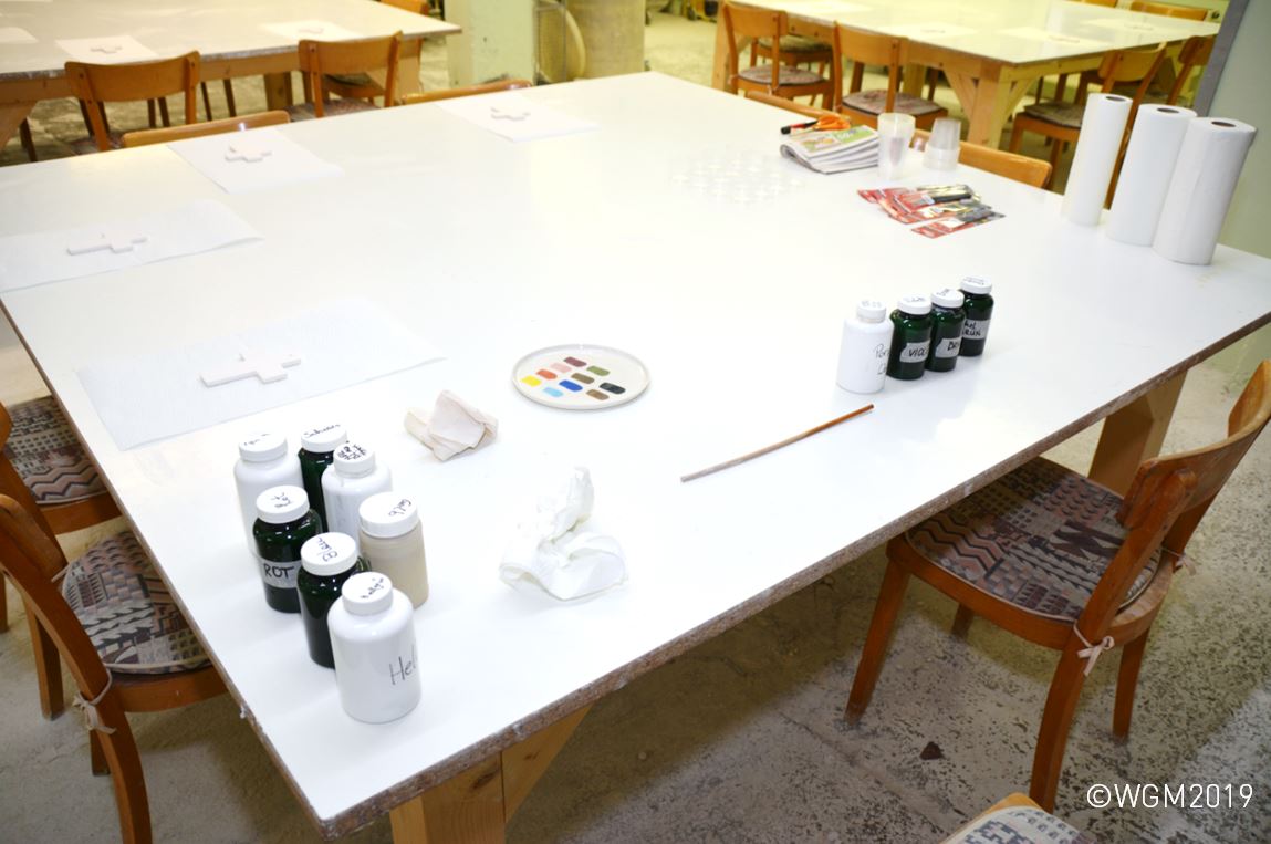 Keramik-Kreuze sowie speziell dafür angefertigte Farben - die Engoben. Manche Kinder hatten