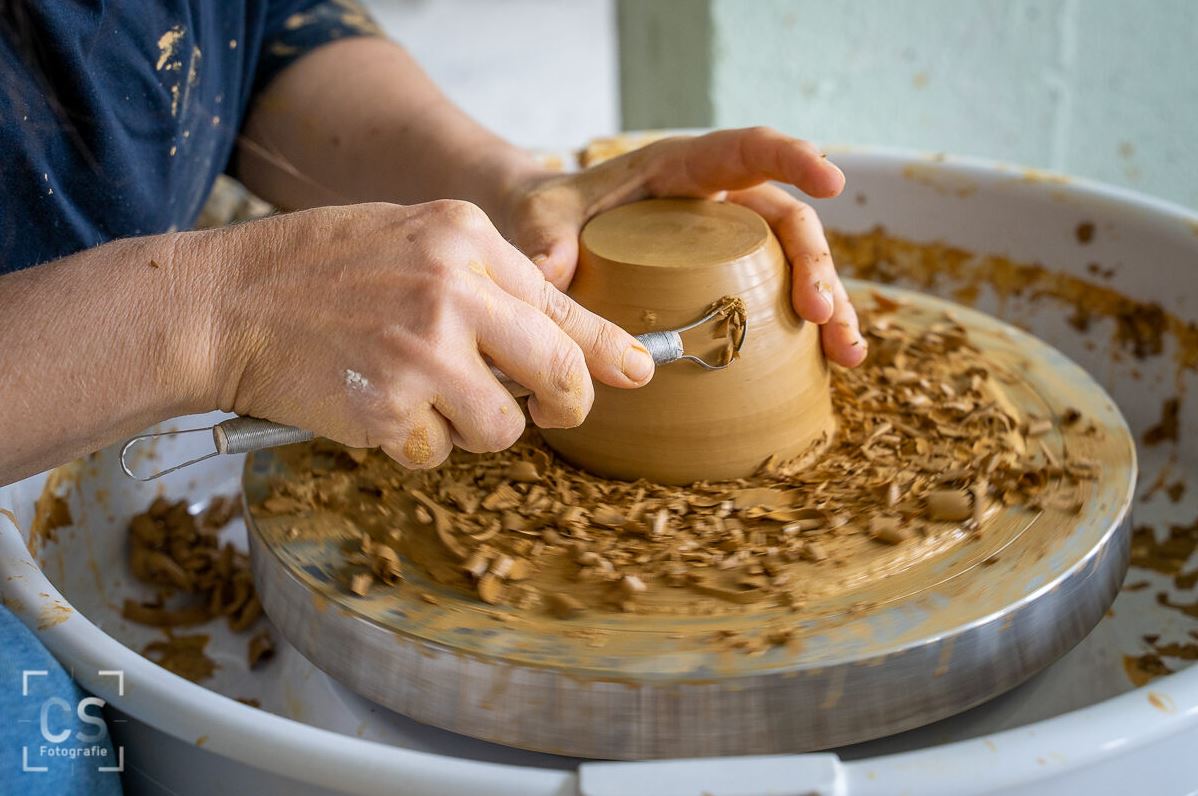 Die Drehscheibe ist das Werkzeug, welches Christine perfekt beherrscht, und in Form von Kursen bei uns in der Daisyworld im Keramik-Studio vermittelt. Hier geht es aber nicht nur um Leistung und Perfektion, sondern auch um das körperliche Wohl wie Entschleunigung oder zur Ruhe kommen und auch die geschichtsträchtige Umgebung der alten Geschirr-Fabrik trägt zur allgemeinen Entspannung bei.