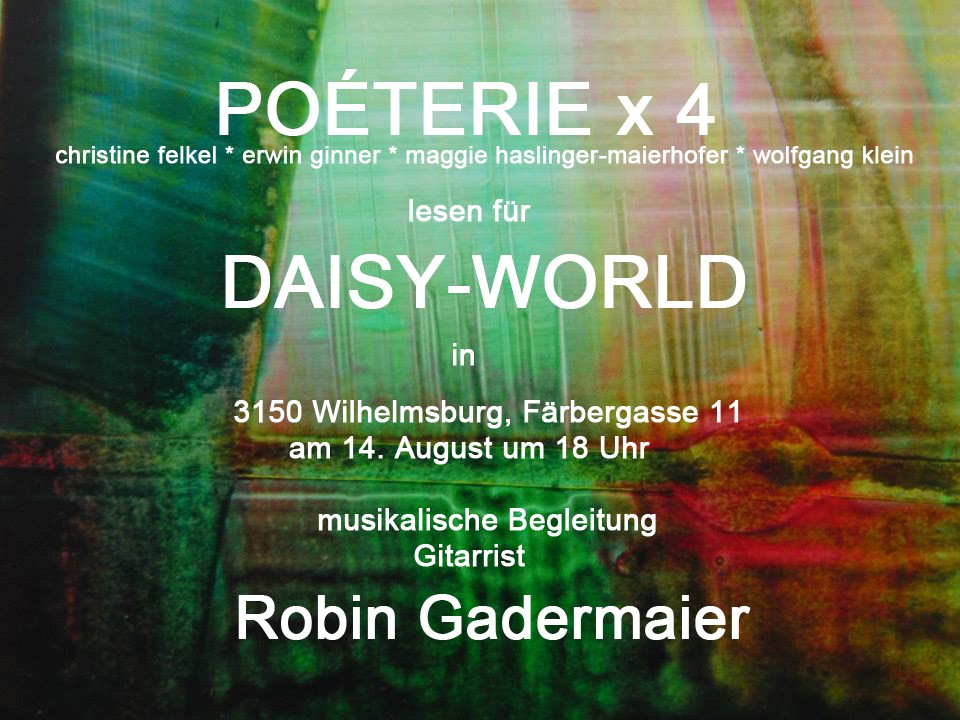 Am 14.8.2021 um 18Uhr lesen sie im Rahmen der Daisy-World-Ausstellung persönlich ihre neuen Gedanken. Das Poesie-Quartett besteht aus Christine Felkel, Maggie Haslinger-Meierhofer, Erwin Ginner (ist als Stachelmitglied auch mit Bildern und Keramiken vertreten) und Wolfgang Klein, alle im Bezirk Neulengbach beheimatet.
