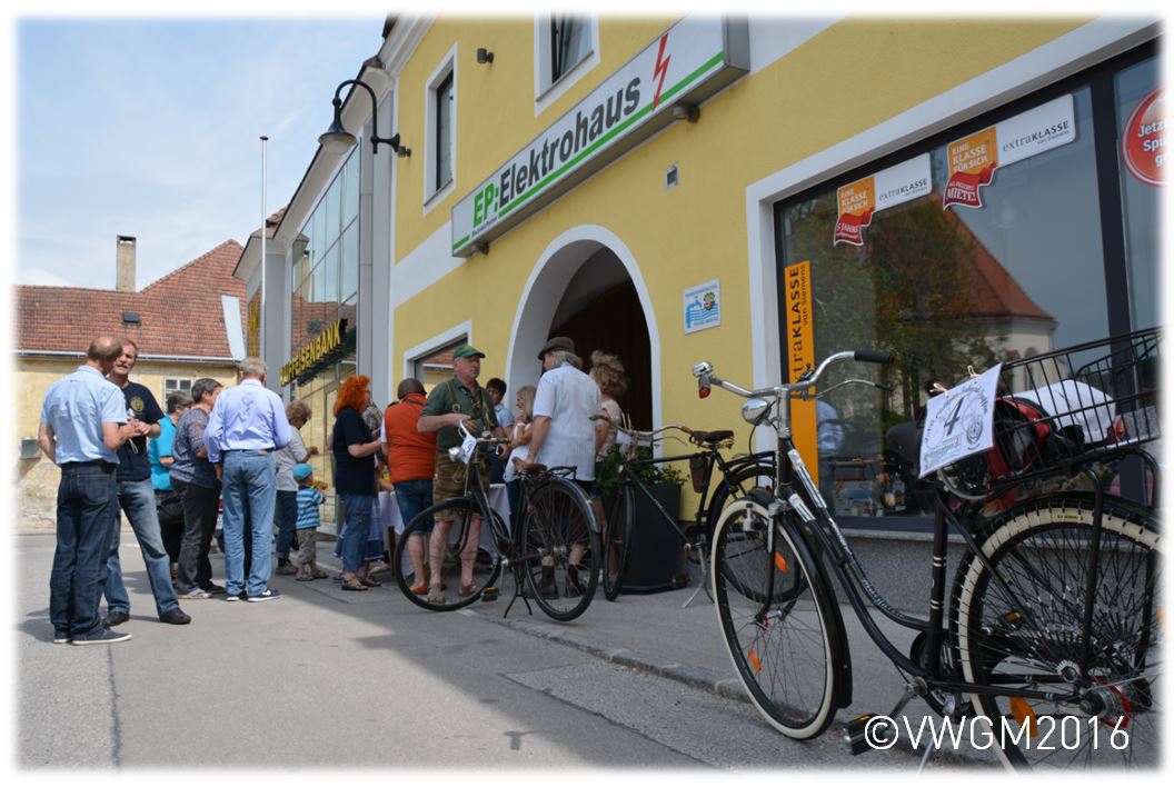Bevor jedoch der Weg in... Wilhelmsburg in die einstige Winckhlmühle führte, stand noch eine Stärkung am Hauptplatz - gesponsert vom Elektrohaus Wilhelmsburg - am Programm. Der Leiter des Elektrohauses Peter Prischl – großer Fan von historischem „Krempel“ - war natürlich auch selbst mit einem historischen Fahrrad unterwegs.